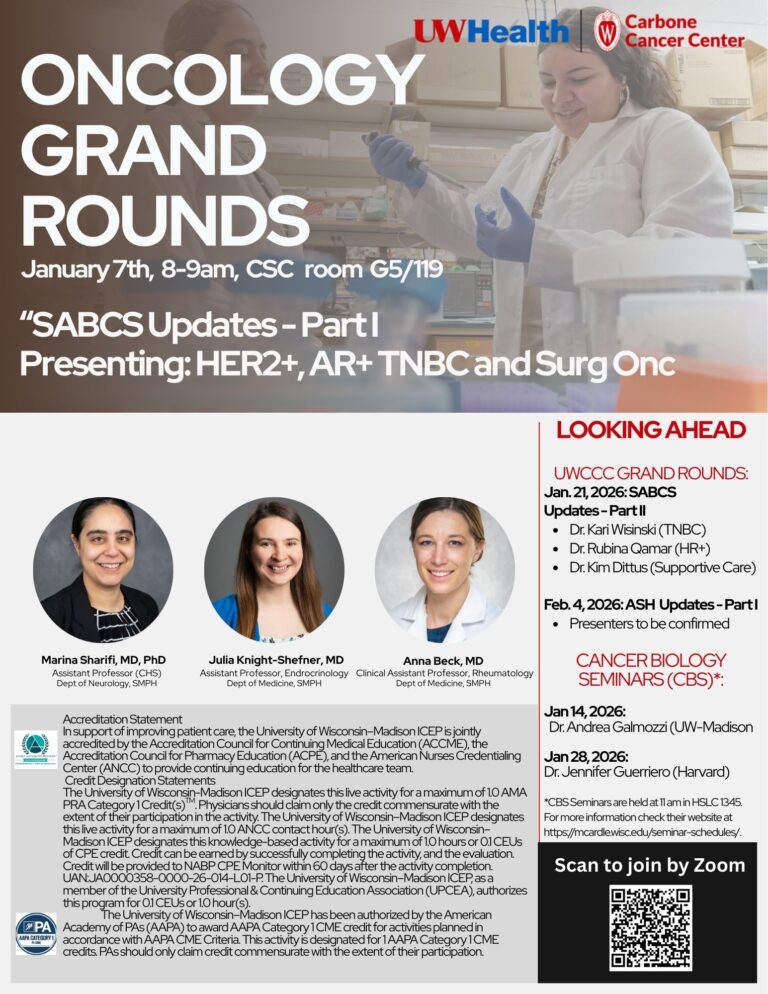 Grand Rounds is a way for UW Carbone Cancer Center members, faculty, staff, and trainees to stay up to date on the latest developments in clinical practice and cancer related research. Regardless of cancer center affiliation, anyone may attend any Grand Rounds unless otherwise noted.