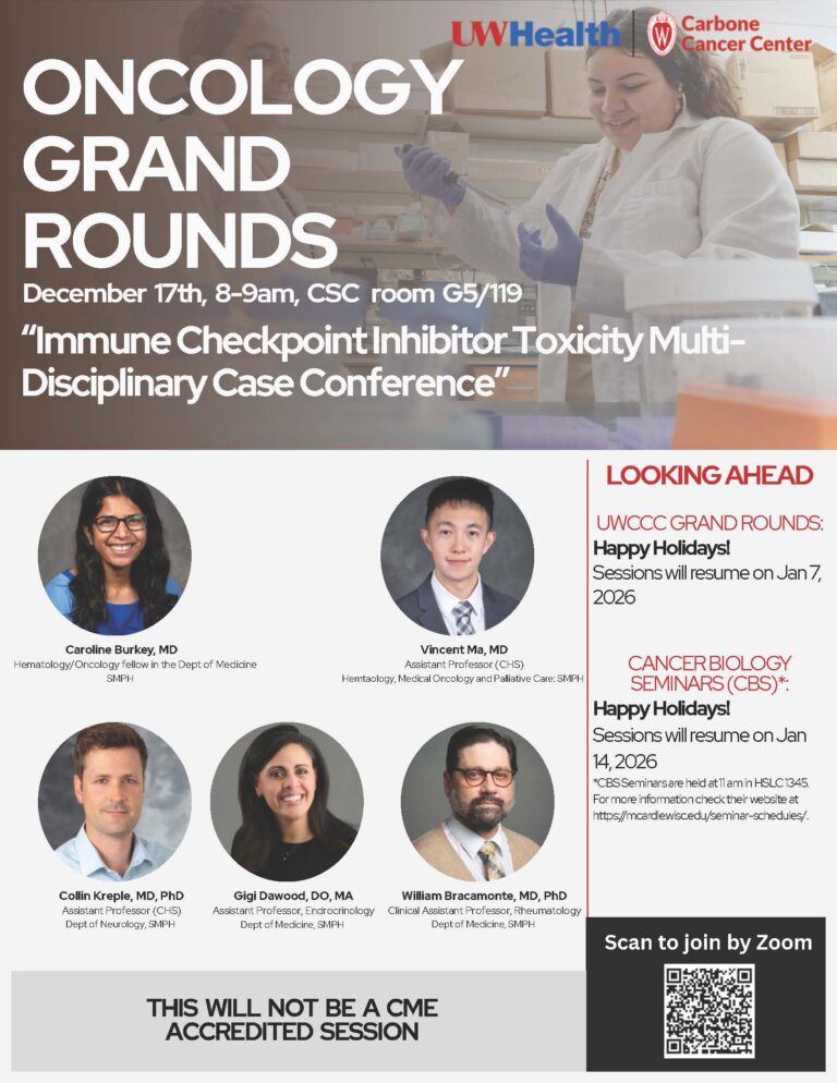 Grand Rounds is a way for UW Carbone Cancer Center members, faculty, staff, and trainees to stay up to date on the latest developments in clinical practice and cancer related research. Regardless of cancer center affiliation, anyone may attend any Grand Rounds unless otherwise noted.